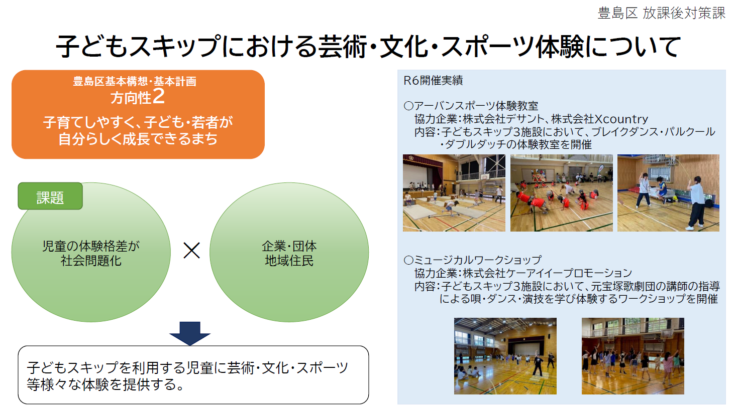このような状況を打開し、体験格差を少しでも是正すべく、新しい取り組みとして、夏休みや平日の放課後、主に小学校1年生から3年生向けに、他区では体験できない「チームとしま」ならではの、遊びや体験ができるプログラムを学校の体育館等でご提供いただきたいと考えています。