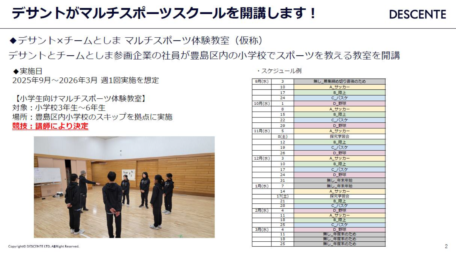 株式会社デサントは子どもスキップ目白で、当社の社員を講師としたマルチスポーツスクールを開講します。