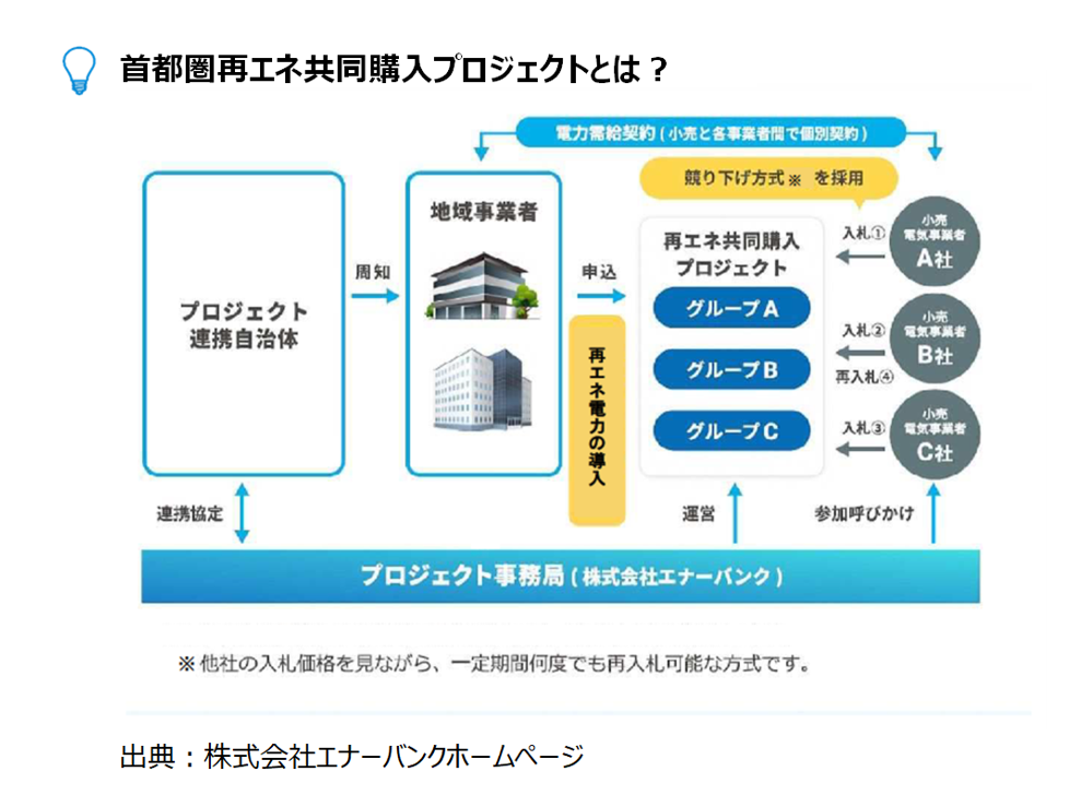 CO2排出量の削減の一環として事業者の皆さまの再エネ電力への切替を支援する「首都圏再エネ共同購入プロジェクト」を促進しています。