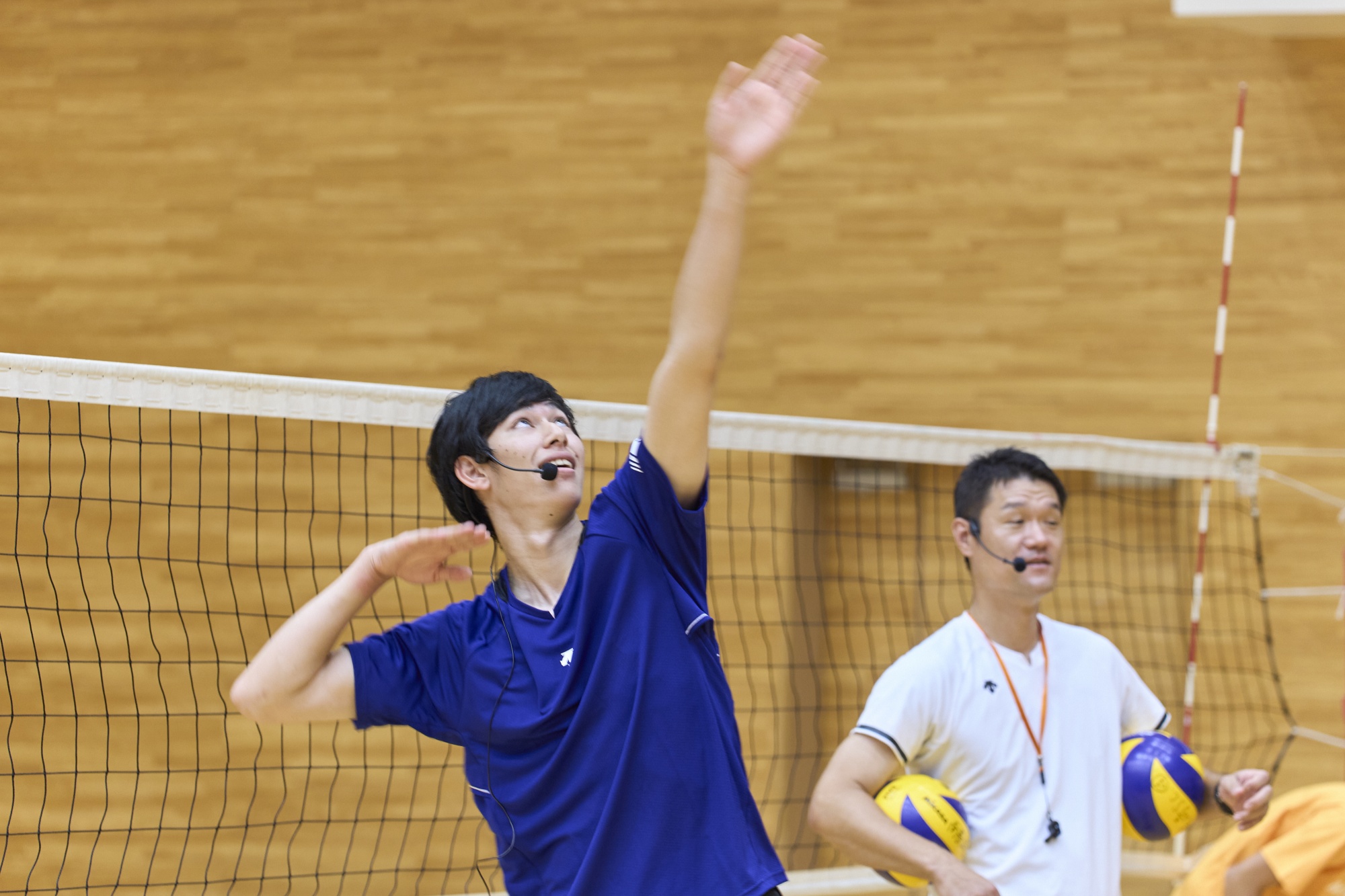バレーボール体験では、甲斐選手がスパイク、レシーブ、サーブなど様々な動きのコツを伝授。子どもたちはアドバイスをすぐに実践し、練習の中でどんどん吸収していきました。