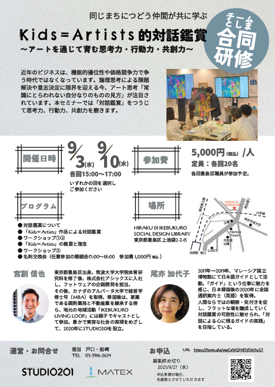 この度、マテックス株式会社、STUDIO201より素晴らしいご提案をいただき、合同研修の実施に至りました。池袋を中心に活動しているKids=Artisitsの作品を題材に『対話鑑賞』を通じて、「正解のない課題」に対して「自分なりの答え」を見出す『アート思考』を実際に体験し、「違いを理解し、自身の強味を知る」研修を実施いたします。